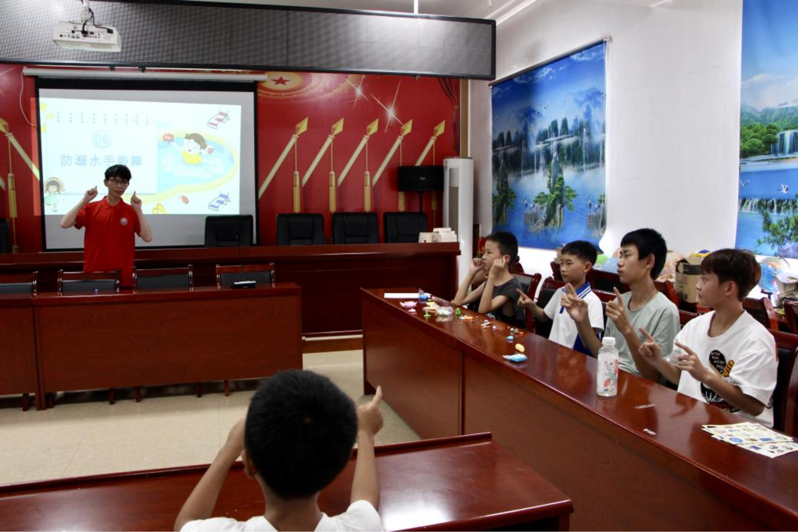 在防溺水安全教育课,以趣味动画和情景演绎开场,直观呈现溺水危险。紧扣“六不准”原则,团队创新使用当地实拍水域照片标注风险点,并运用方言“莫一个人跑到河边耍水”等通俗表达。实践环节,志愿者组织“发现同伴溺水”情景扮演,纠正“手拉手施救”等误区。孩子们还学习了防溺水手势舞,掌握“呼救—找工具—报警”的科学救援步骤。