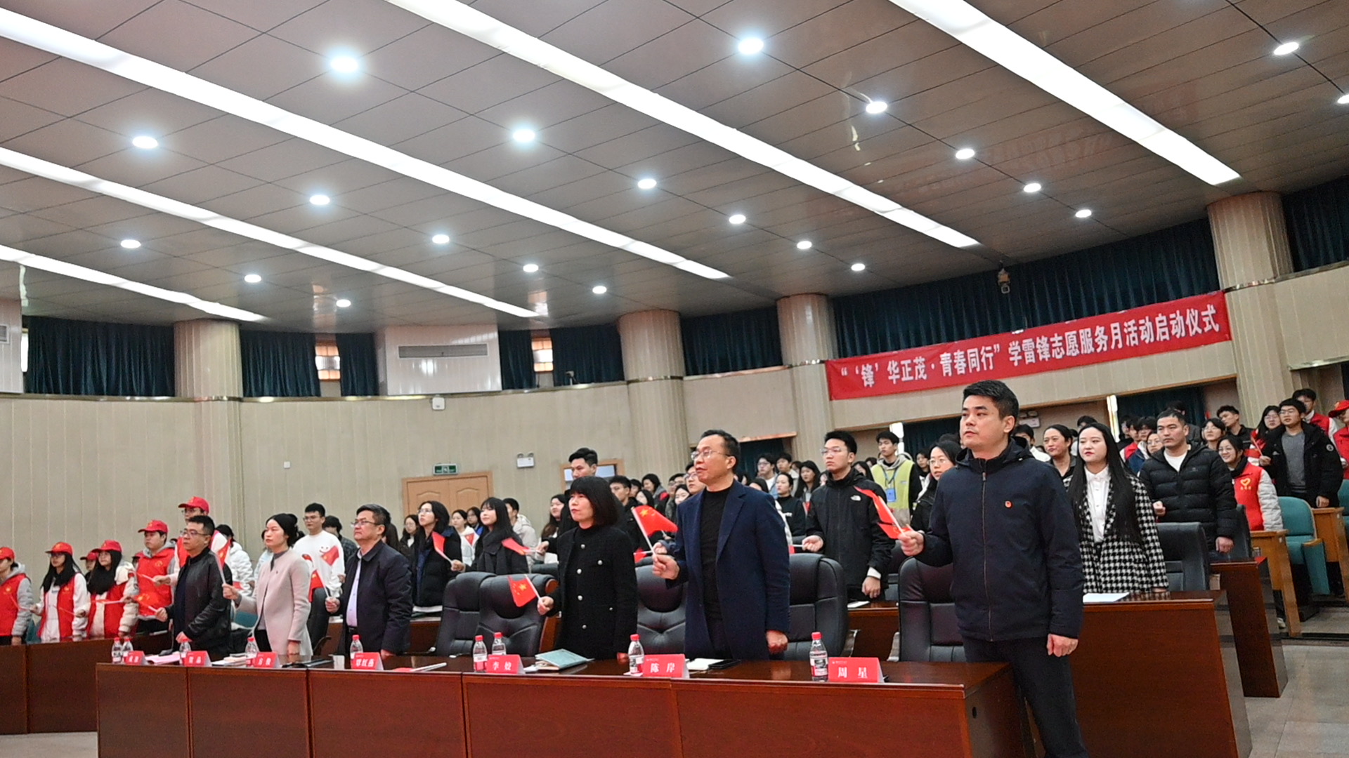 仪式现场,与会领导为各学院志愿服务队授旗。鲜红的旗帜既是责任,更是使命,引领着广大青年志愿者们以饱满热情投身服务,诠释湘农青年的担当。最后,启动仪式在全场师生齐唱《学习雷锋好榜样》的歌声中圆满结束。