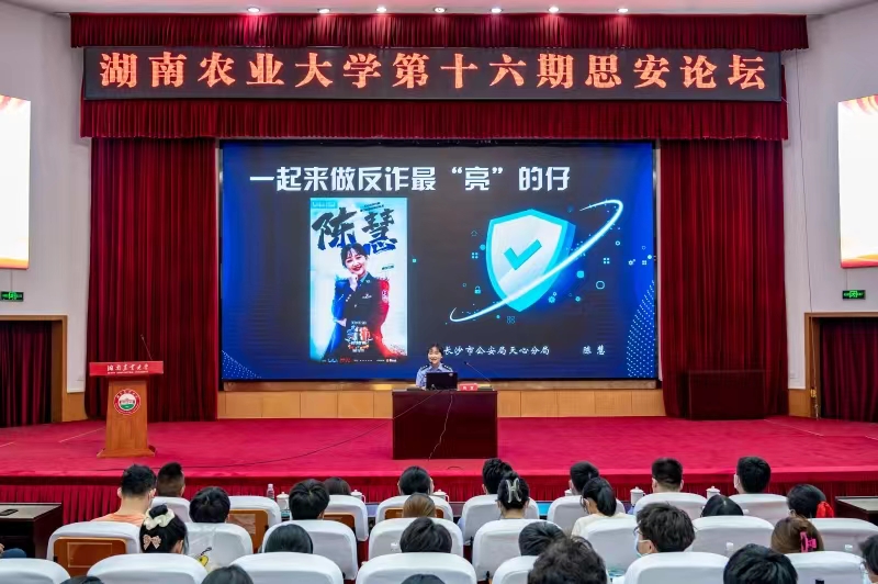 2022年9月27日晚,湖南农业大学第十六期思安论坛暨“全民行动、无诈三湘”湘警学雷锋志愿服务活动在修业讲堂顺利举行。长沙市天心公安分局刑侦大队中队长陈慧、长沙市人民警察学校教官贺克与湖南省公安厅青年民警代表一同走进农大校园,带领师生一起做反诈最“亮”的仔。在疫情防控常态化要求下,本次活动也开启了线上直播,2000余名学生相聚云端,共同聆听新学期反诈第一课。