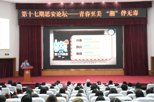 10月28日下午,湖南农业大学第十七期思安论坛暨“青春至美 ‘湘’伴无毒”禁毒宣传活动在修业讲堂顺利举行。长沙市强制隔离戒毒所的陈乐天警官做客本期思安论坛,为同学们带来一场深入浅出的禁毒知识讲座。