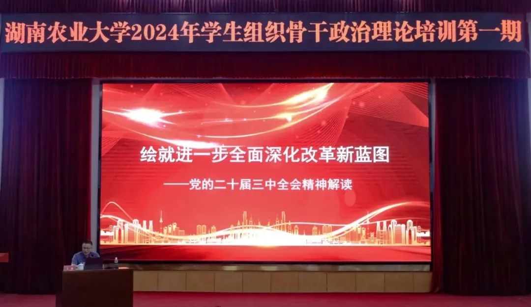 9月19日下午,湖南农业大学学生组织骨干政治理论培训第一期在修业讲堂召开,校党委宣传部、统战部常务副部长王健应邀作党的二十届三中全会精神宣讲报告。同时,参加本次会议的有校团委副书记周星、黄佳彦,校团委老师寻滢,团委各中心、学生会、研究生会、学生社团管理中心、党委宣传部融媒体中心主要学生干部等200余人参加会议,本次大会由周星主持。