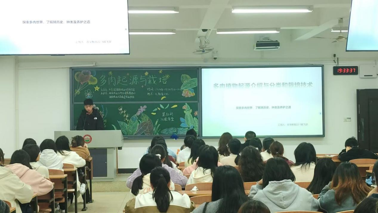 随着冬日的脚步悄然临近,一场以“多肉起源与栽培”为主题的湘农学堂于2024年11月17日晚在九教南205顺利进行。本次湘农学堂由韩飞宇同学主持,绿色农业协会管理层全体成员及预备会员参加。