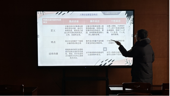 主讲人还提到,人物访谈有三要素:挑选合适受访对象,就像选好影评人点评《哪吒2》很关键;访谈要有逻辑,设计访谈提纲、想好开场白并预演调整必不可少;访谈后的校对修正也不容忽视,要预防粗俗、不合适的话语,避免断章取义,尽量保留原话。编写访谈报告时,更要充分考虑受众需求。期间,为让大家更好掌握倾听技巧,还现场播放了《鲁豫有约》视频,通过经典案例说明成功访谈的要点。