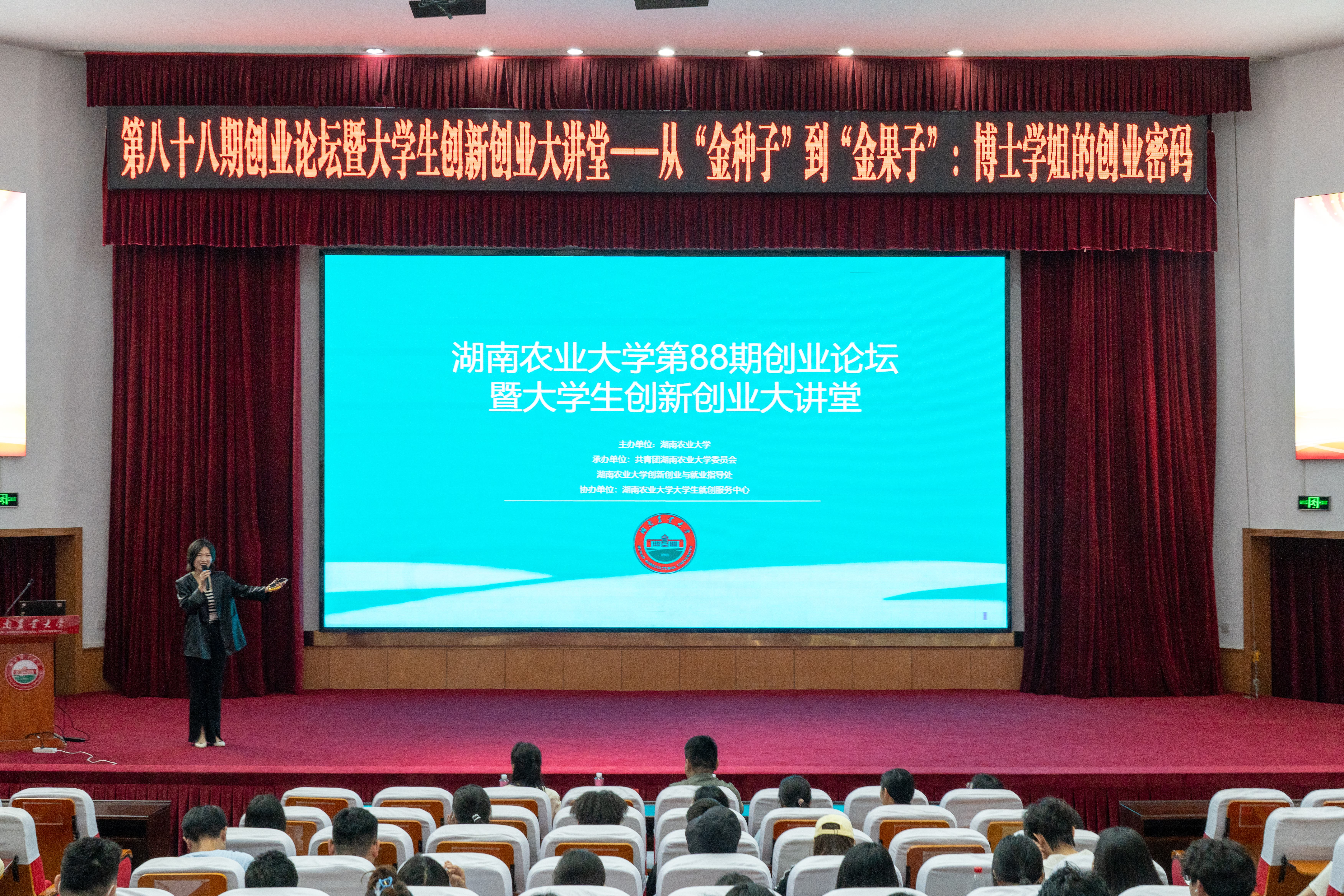 4月21日下午,湖南农业大学第八十八期“创业论坛暨大学生创新创业大讲堂”在修业讲堂隆重举行。中国农业大学兽医专业博士研究生、长沙闪灵智合生物科技有限公司创始人刘园园校友作为主讲嘉宾,以“从‘金种子’到‘金果子’:博士学姐的创业密码”为主题,为农大学子带来了一场精彩的创业经验分享。