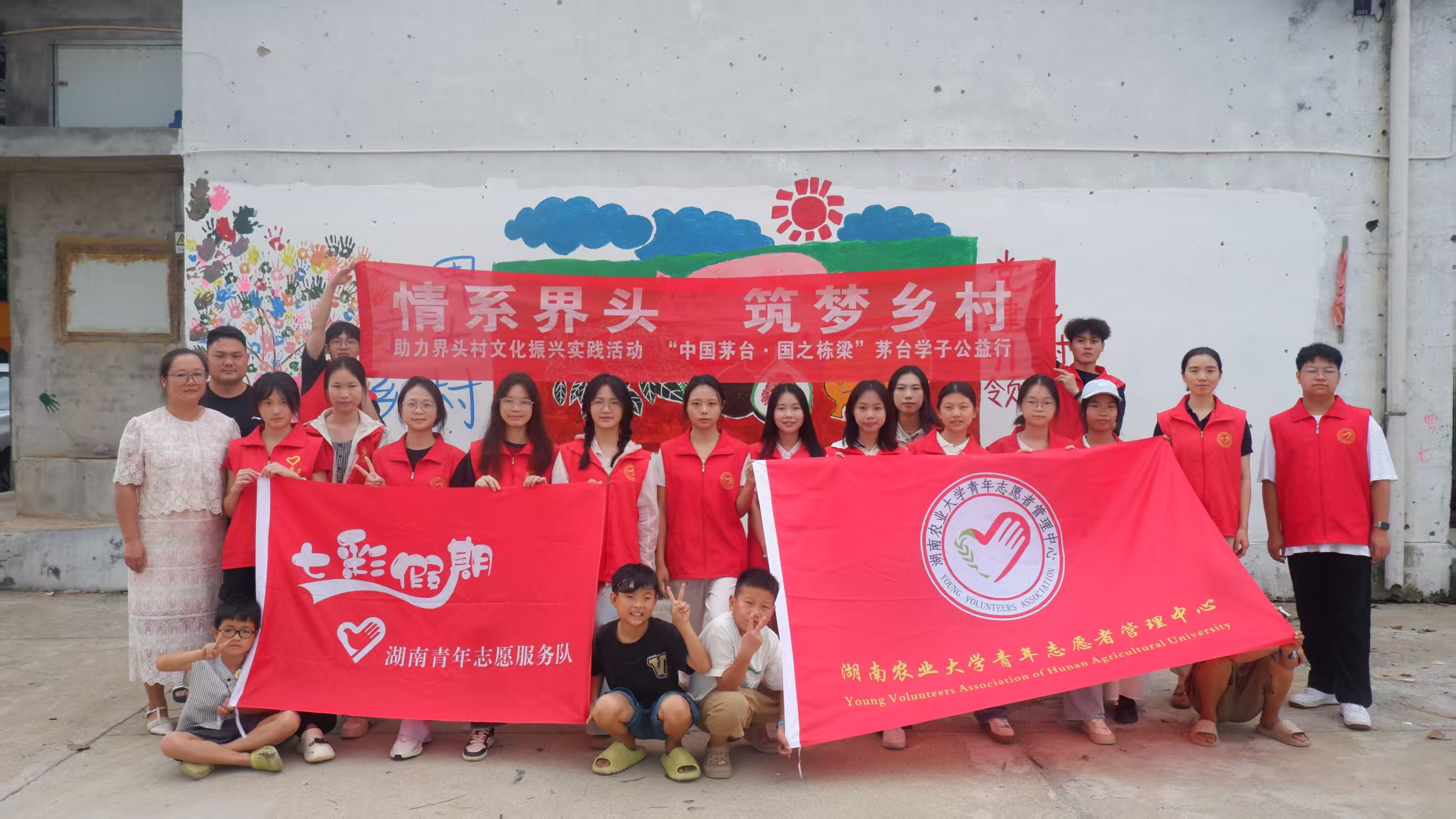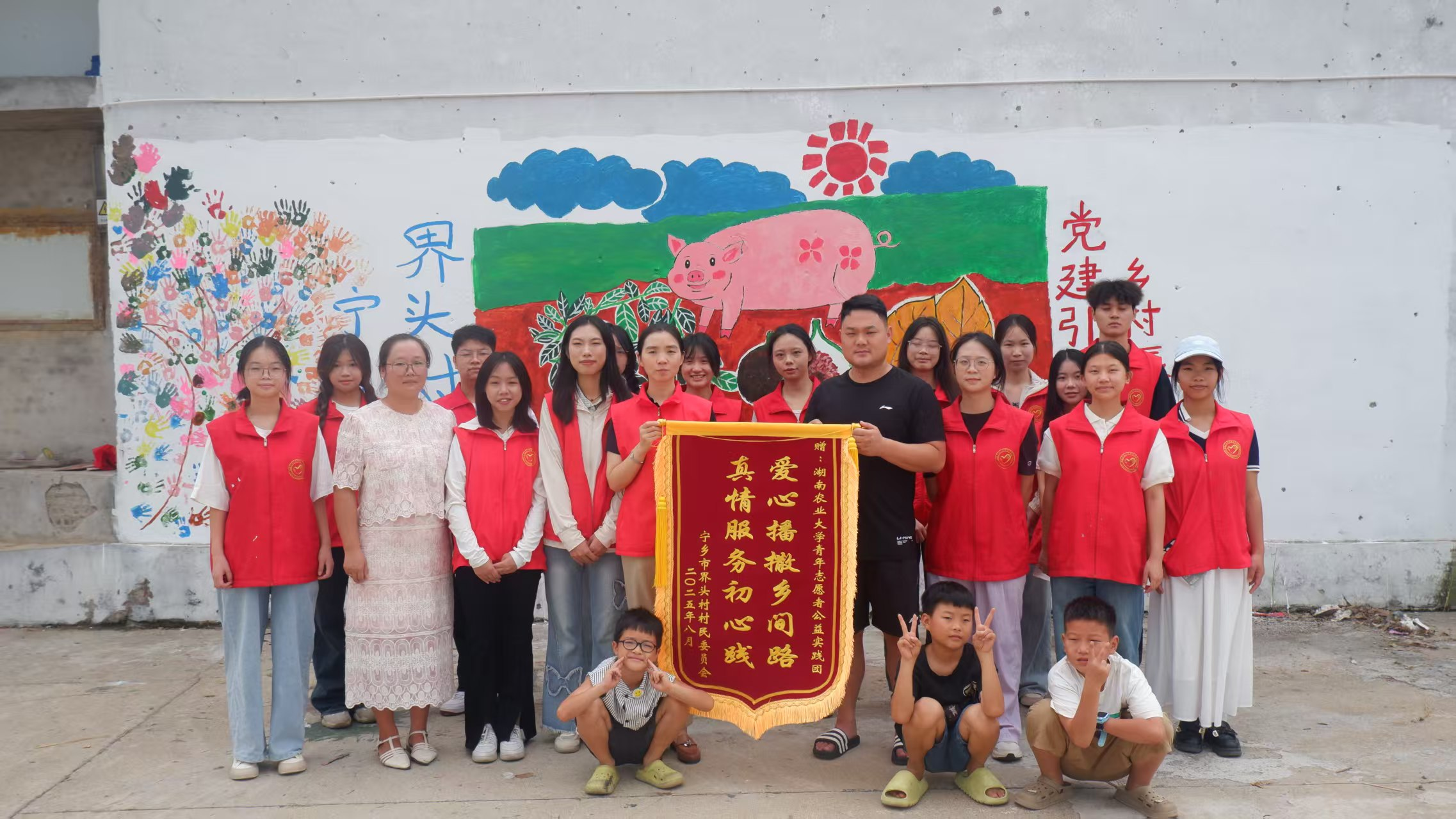 活动开始前,校团委黄佳彦老师和本次志愿服务带队负责人肖慧婷同学分别就安全教育问题及活动内容发表讲话,要求参与本次志愿服务的湘农学子言行自律,恪守规范,认真完成墙绘和支教两大主要任务,彰显湖南农业大学“朴诚、奋勉、求实、创新”的校训校魂。而参与本次志愿服务的湘农学子也是不负众望,做到了出色履职,热忱奉献:从栩栩如生的村头墙绘到应答积极的课堂互动,从同心共情的村委、志愿者到互敬互爱的学生、小老师。湖南农业大学学子用教育拓宽了孩子们的世界,用色彩点燃界头村的热情。与此同时,湖南农业大学学子也从此行中收获了服务社会所带来的满足感,勇担使命所带来的责任感。